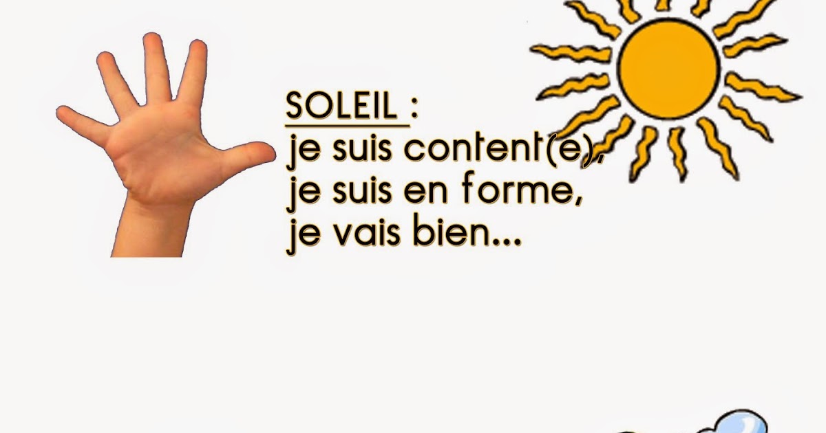 A la fin de chaque demi-journée, tout le monde ; enfants, enseignante et ATSEM donnait en regroupement SA météo de ce moment partagé. Chacun indiquait avec sa main son ressenti de la demi-journée : main ouverte, c’était le soleil qui signifiait que tout c’était bien passé. Poing fermé, c’était le nuage qui annonçait un point de vue plus mitigé. Main renversée avec les doigts vers le bas ; l’orage et rien ne va. Ceux qui le désiraient (adultes compris) prenaient un moment pour en parler.
